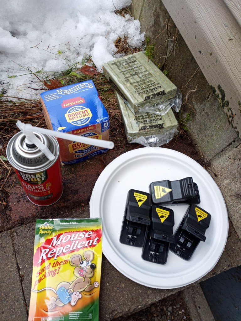 (As I remember my friend and coworker Dave J. saying “if it’s worth doing, it’s worth overdoing!”) I can highly recommend these Feeke brand mouse traps available on Amazon, so far in the barn I’ve only had one mouse escape the Feeke traps. I don’t use this Tomcat mouse poison anywhere but the crawlspace because I don’t want any other animals getting into it outside or the barn, but the poison is fair game for the crawlspace. The Fresh cab Rodent Repellent has good reviews and is actually balsam fir needles.